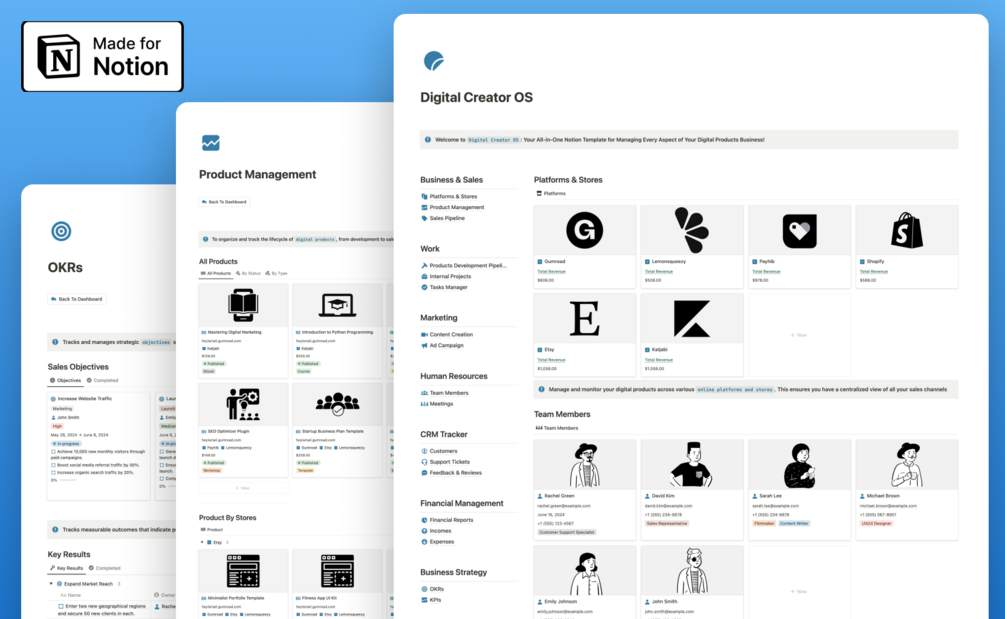 The template helps you stay organized, manage your team, and streamline your workflows, allowing you to focus on what matters most—growing your business and creating amazing digital products.