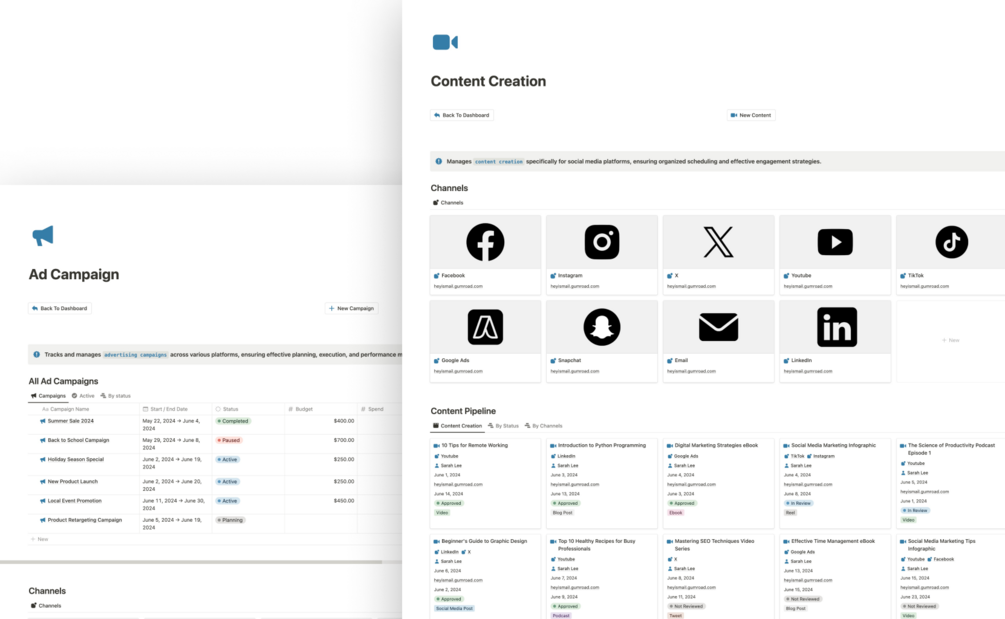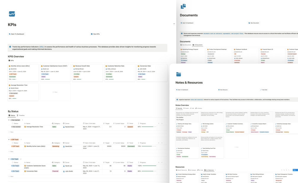 - Notes & Resources Database: Capture ideas, brainstorm strategies, and store valuable resources all in one place.