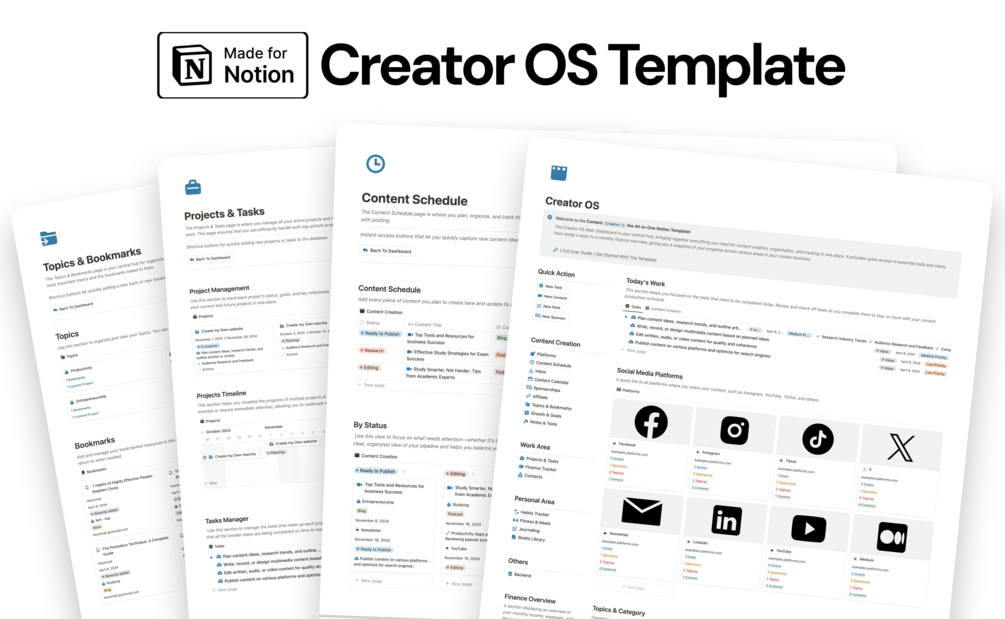 The Content Creator OS template helps you stay organized and efficient, from managing your content across different platforms to tracking sponsorships and financials. It provides a structured approach to content creation that boosts productivity and enhances strategic planning.