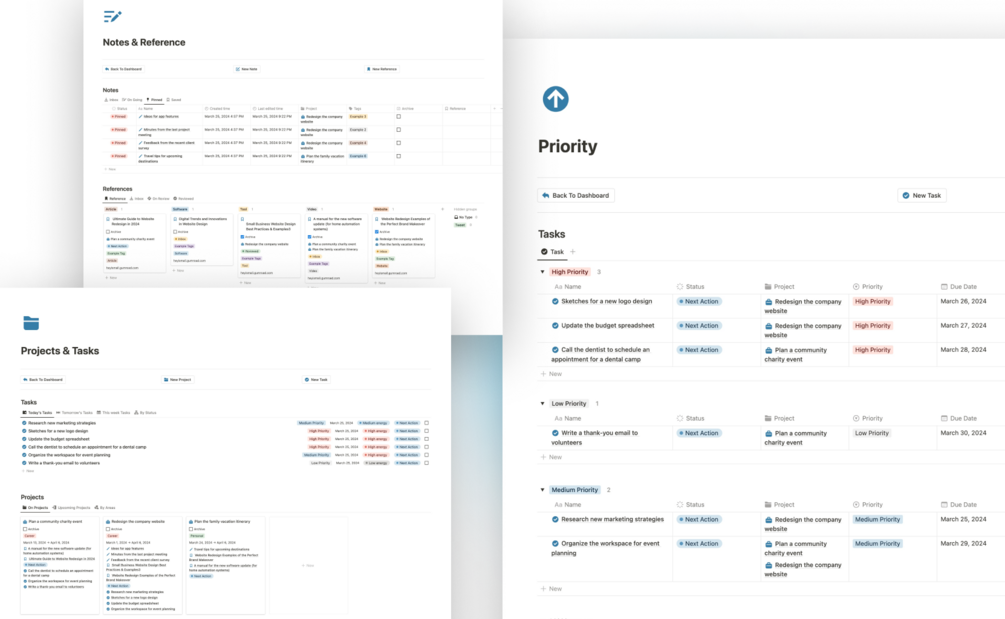 The template includes key components such as an Inbox, Next Actions, Weekly Review, Projects, Tasks, Notes, References, Calendar, Priority, and Archive—everything you need to manage your tasks and stay organized.