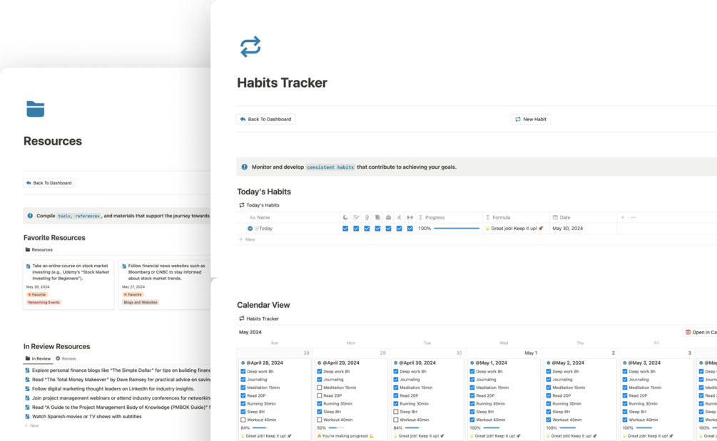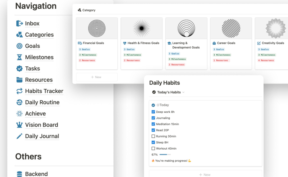 Designed for ambitious individuals who are serious about achieving their goals, this template integrates goal setting, habit building, and daily routines into one cohesive framework. From outlining your vision to tracking daily tasks and milestones, Goals Tracker Pro gives you the structure to turn goals into reality.