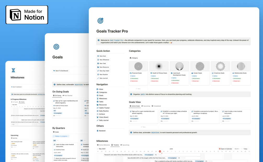 Goals Tracker Pro is a comprehensive Notion template designed to help you set, track, and achieve personal and professional goals. It includes features like goal-setting, habit tracking, milestone management, and a vision board to keep you motivated and organized.