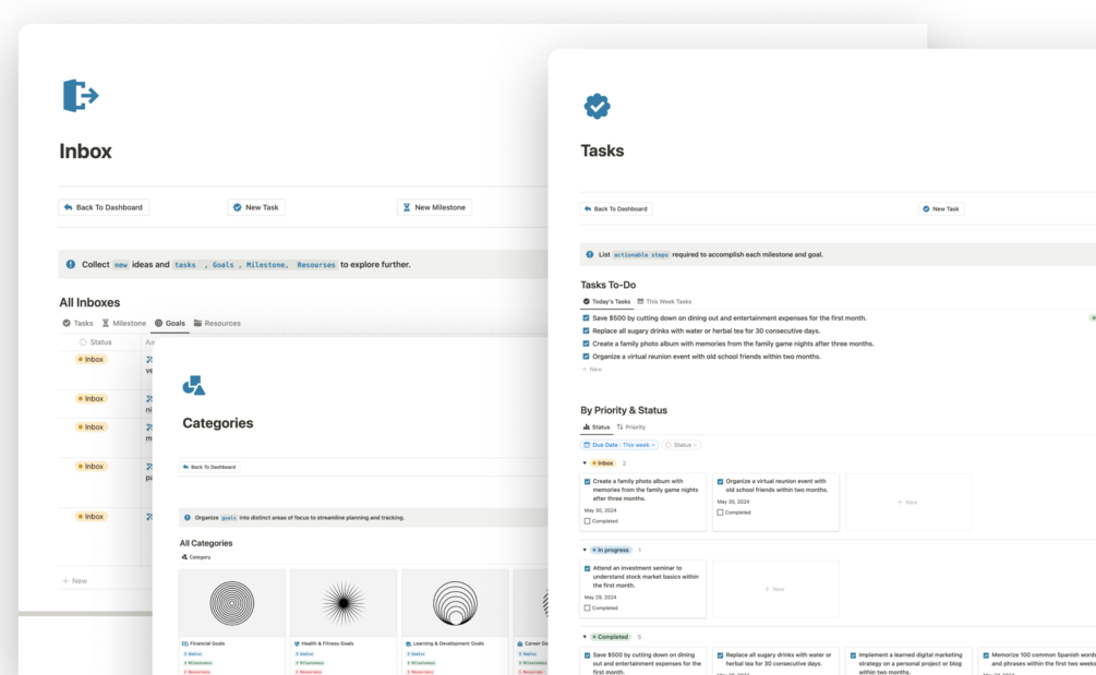 The template includes an Inbox, Categories, Goals, Milestones, Tasks, Resources, Habits Tracker, Daily Routine, Achieve Tracker, Vision Board, and Daily Journal, ensuring every aspect of your goal-setting process is covered.