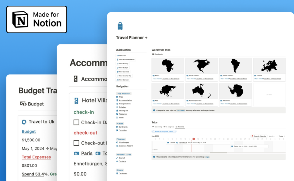 - Build a central hub for all your trips with dedicated databases for Trips Planner, Accommodation, Transportation, Activities.